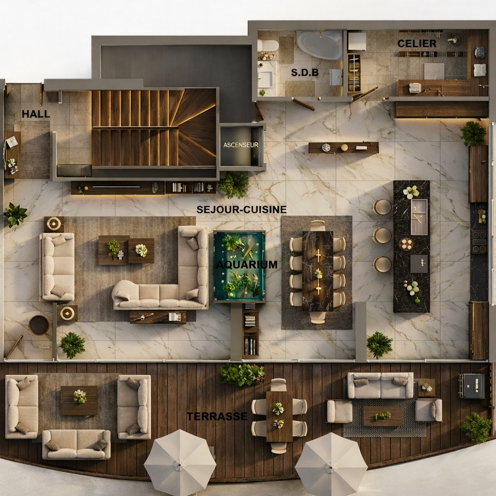 - Matériaux les plus précieux : marbres rares (Calacatta, Statuario), essences de bois exotiques, verre sur mesure.
