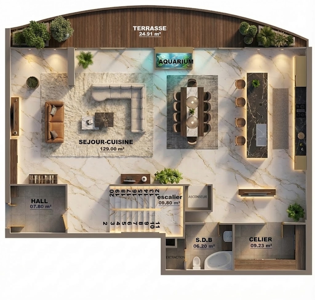 Posséder la Villa Skyline par Elite Promotion Immobilière, c’est embrasser un mode de vie où le raffinement est une constante. Avec sa surface généreuse de 532,50 m², cet attique se distingue par ses aménagements ultra-luxueux et ses audaces architecturales pensées pour le confort et le divertissement.